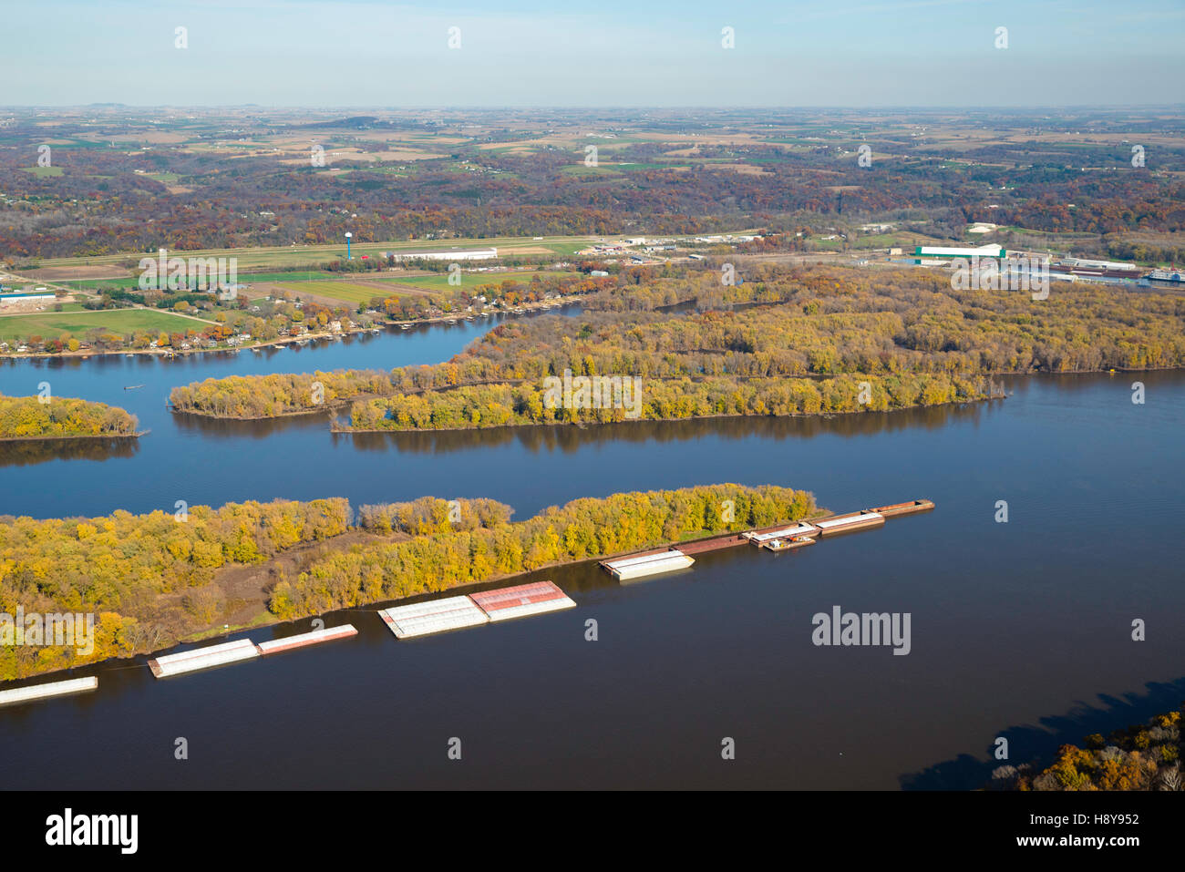Aerial View Of Dubuque Iowa And Barges On The Mississippi River